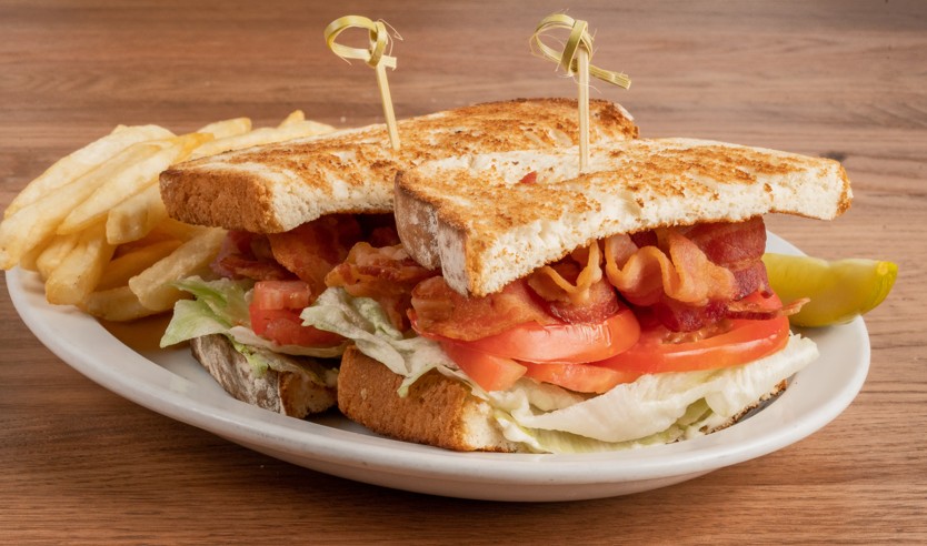 Crispy bacon, fresh lettuce and tomato served on white bread with mayonnaise served with french fries.