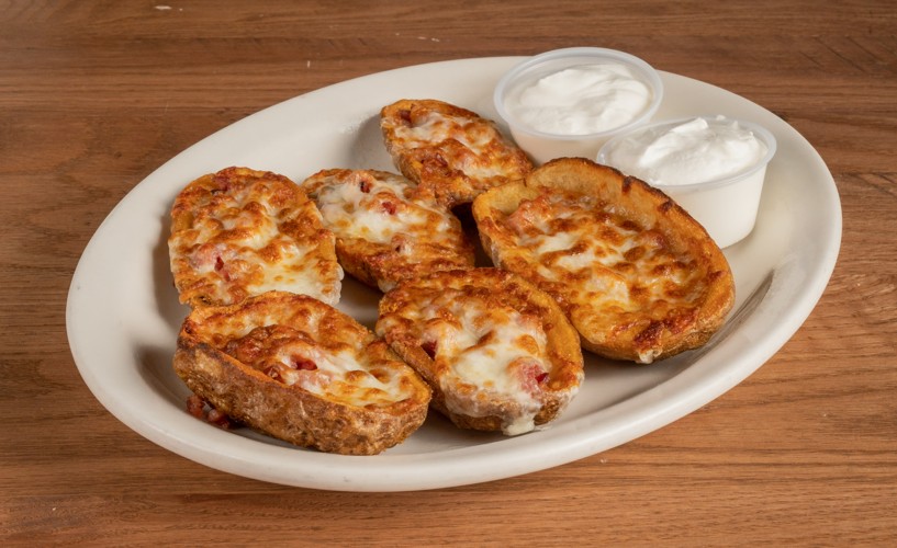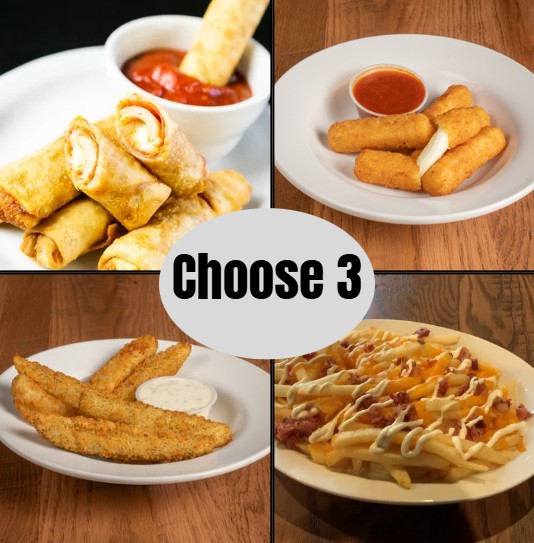 2 potato skins, 2 pizza logs, 2 jalapeno poppers and 2 mozzarella stix served with bleu cheese dip and pizza sauce.