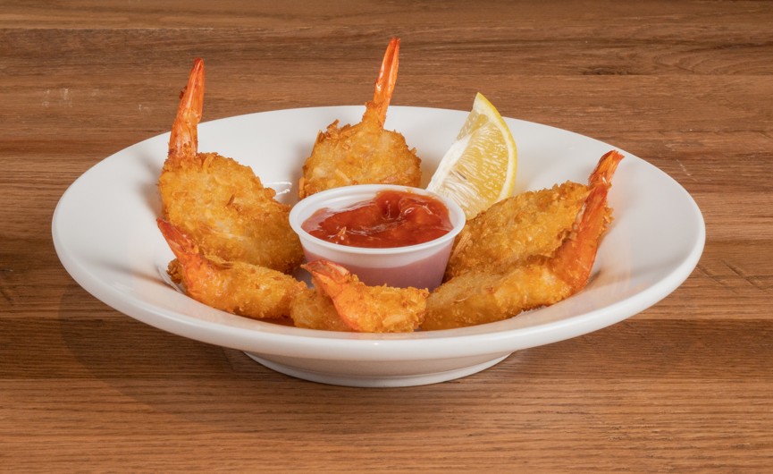 Shrimp is coated in a coconut breadcrumb and quickly fried to perfection.
