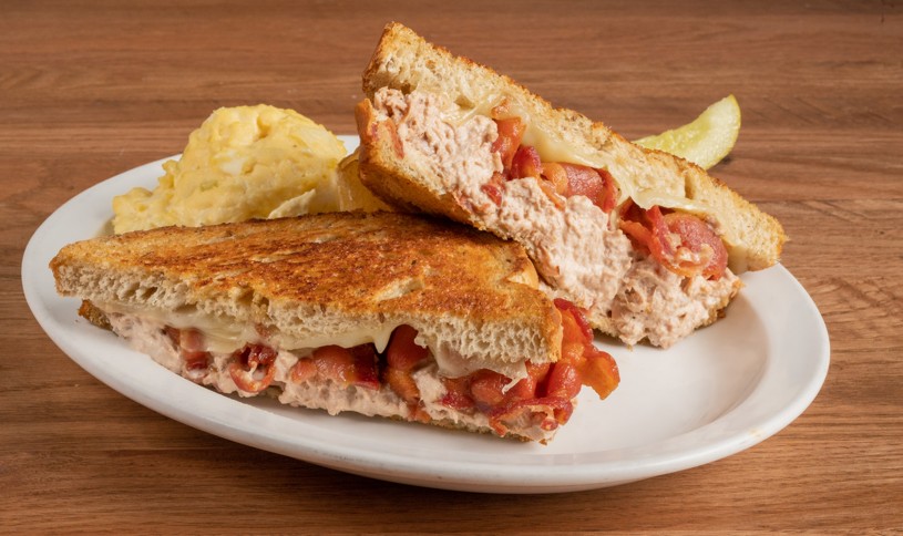 Fresh tuna salad, aged swiss cheese, crispy bacon strips, grilled on rye, served with potato salad.