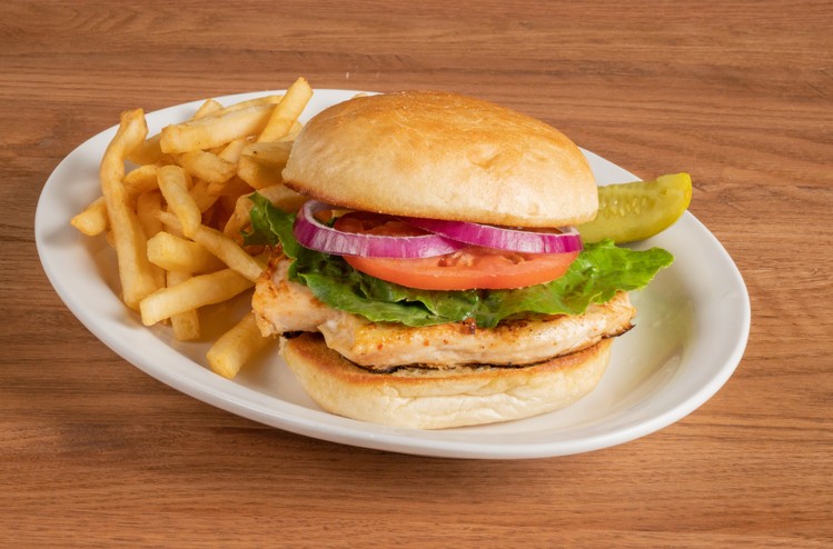 Juicy chicken breast grilled and topped with lettuce, tomato and onion on a fresh roll served with Anchor Chips.