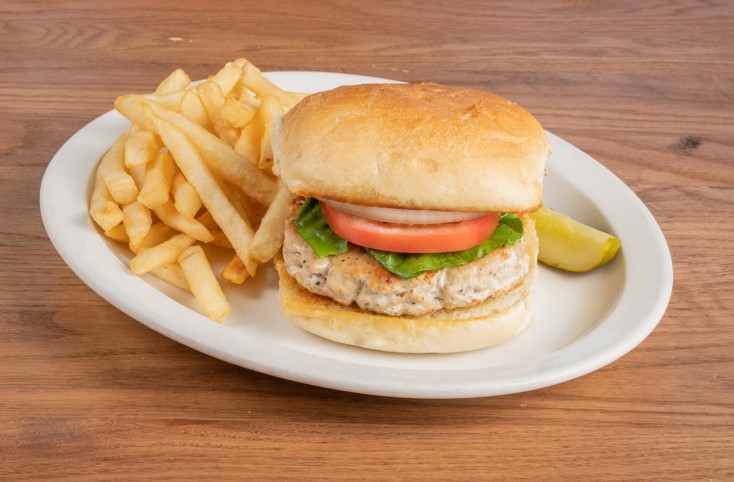 (8 oz) A lean seasoned turkey burger charbroiled to perfection, topped with lettuce, tomato and red onion on a kaiser roll served with french fries.