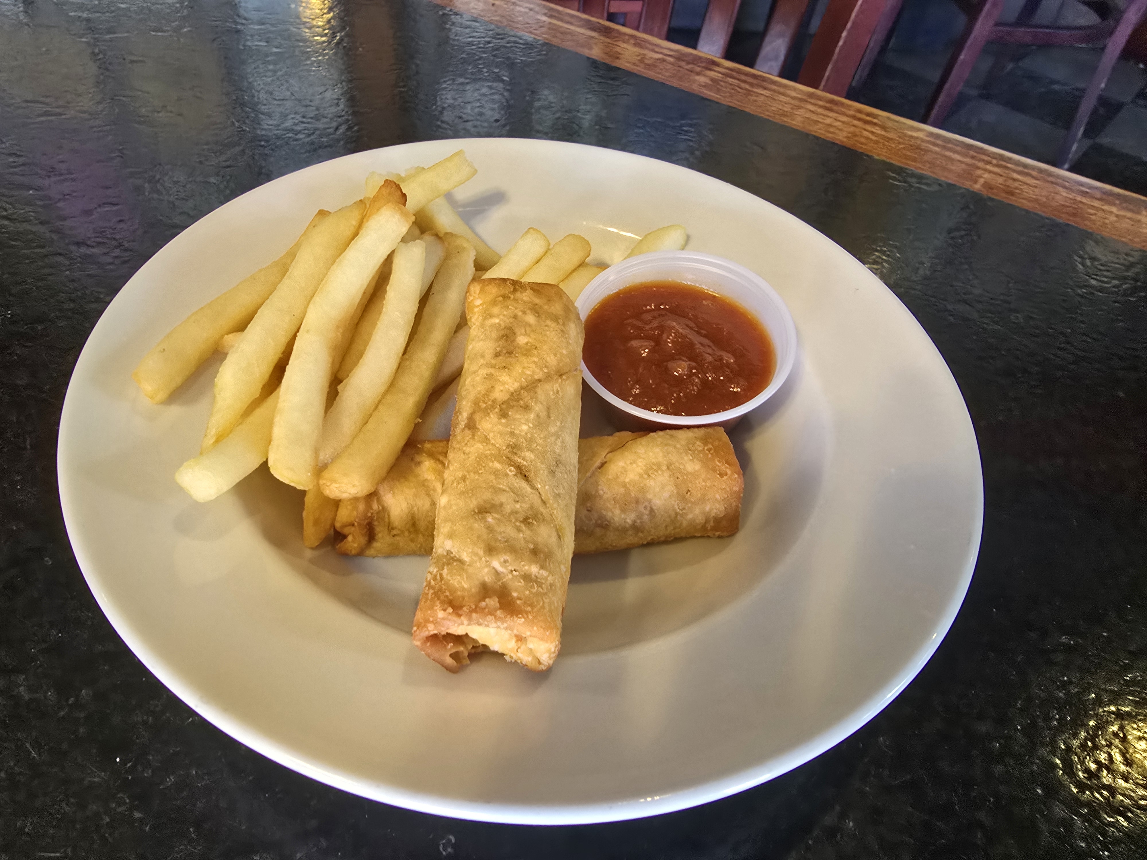 Egg roll wraps stuffed with mozzarella cheese and pepperoni. Served with a side of pizza sauce.
