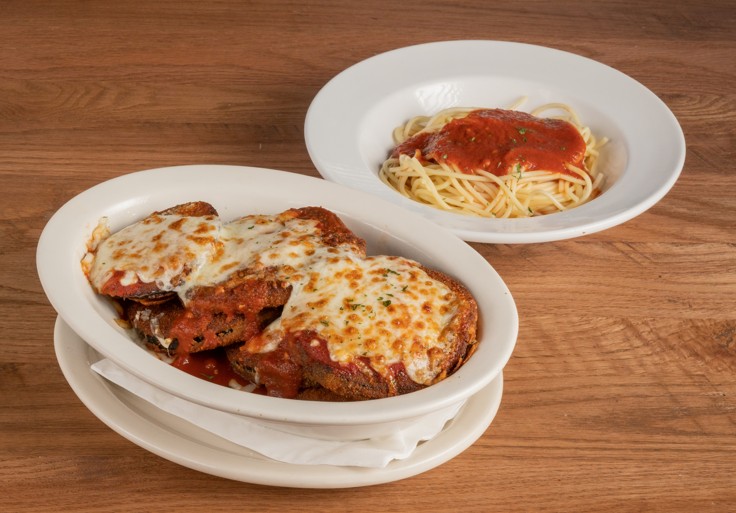 Eggplant lightly breaded and fried, topped with our homemade sauce and smothered in mozzarella cheese served with a side of spaghetti.
