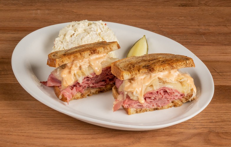 Grilled, sliced corned beef with sauerkraut, swiss cheese, thousand island dressing on rye served with potato salad.